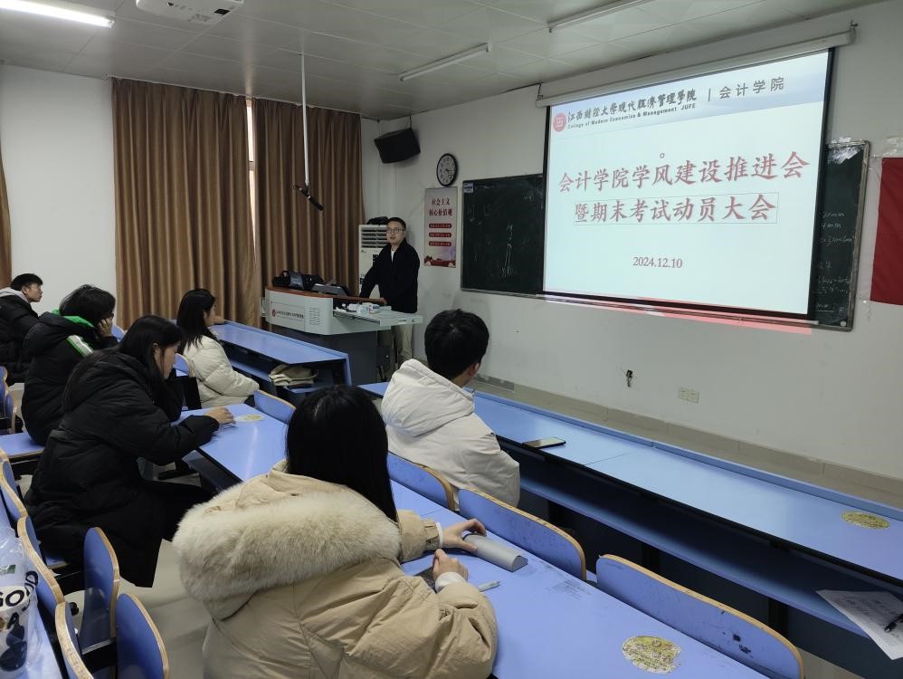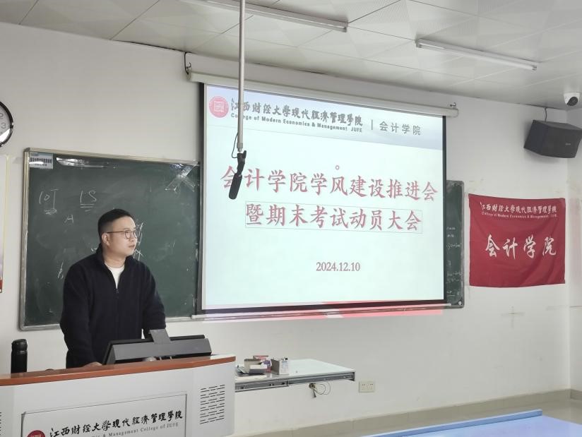 12月10日,会计学院在1206教室召开了学委会议,会中强调了四六级考试及期末考试的注意事项和考风考纪相关事宜,并就学期末的学风建设等问题进行深入讨论。会议由会计学院副院长严宽主持,教学秘书及各班级学委参加了此次会议。